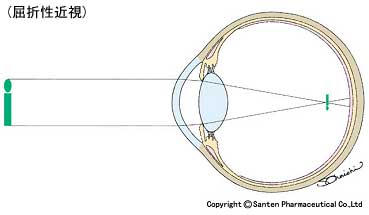 眼軸の長さは、成長に伴い伸びていきます。新生児は眼軸の長さが短く、たいてい遠視の状態になっていますが、角膜・水晶体の屈折力が強くなっているので、 それほどひどくはありません。角膜・水晶体の屈折力は、眼軸の長さが伸びるとともに弱くなり、全体のバランスが調整されるようになります。しかし、環境の 影響などでこれらのバランスが崩れると、近視になると考えられています。